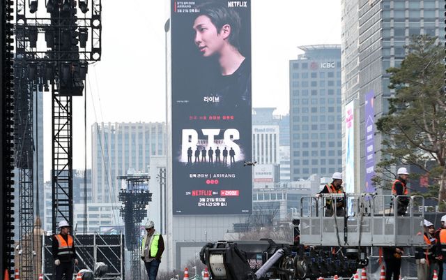 그룹 방탄소년단(BTS)의 컴백 공연을 하루 앞둔 20일 서울 종로구 광화문광장에 메인 무대가 설치되고 있다. ⓒ 연합뉴스