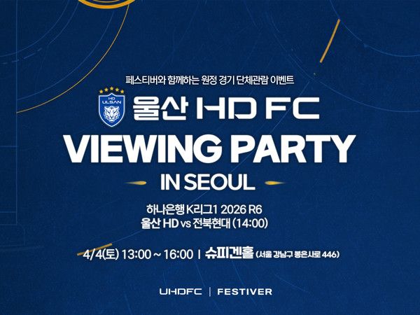 20일 울산은 보도자료를 통해 “페스티버와 4월 4일 오후 2시에 열리는 전북현대와의 리그 원정경기에 맞춰 서울 강남구 소재 복합문화공간 슈피겐홀에서 뷰잉 파티를 진행한다”라고 밝혔다.