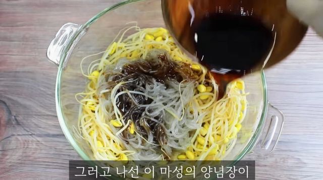 완성된 소스를 당면과 콩나물에 붓는 모습. / 유튜브 '집밥 korean home cooking'