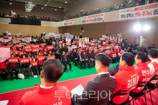 [투어코리아=김교환 기자] 20일 울산 남구 종하 이노베이션센터에서 열린 국민의힘 울산광역시당 지방선거 출마예정자 정견 발표회에서 출마예정자들이 발표를 기다리고 있다.
