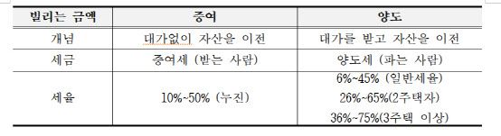 증여세는 10%에서 최대 50%, 양도소득세는 6%에서 최대 45%다. 양도세는 여기에 다주택 중과가 붙으면 최대 75%, 지방소득세까지 합치면 82.5%까지 올라간다.