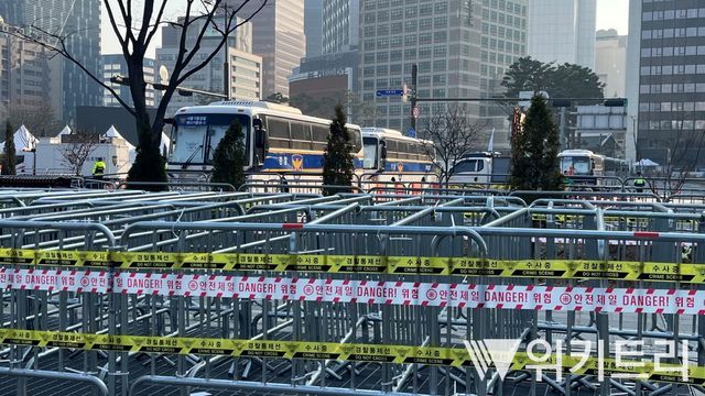 21일 오전 광화문 광장 부근 펜스가 설치되고 경찰이 배치돼 있다. / 위키트리