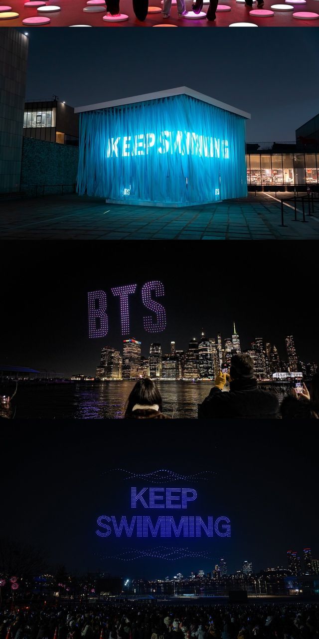 국립현대미술관 마당에 설치된 큐브형 조형물도 눈길을 끌었다. 타이틀곡 ‘SWIM’을 연상시키는 바다빛 외관과 ‘KEEP SWIMMING’ 문구가 어우러져 곡의 메시지를 전했다. 테슬이 바람에 흔들리며 파도 소리처럼 번져 도심 속 힐링 공간을 완성했다.