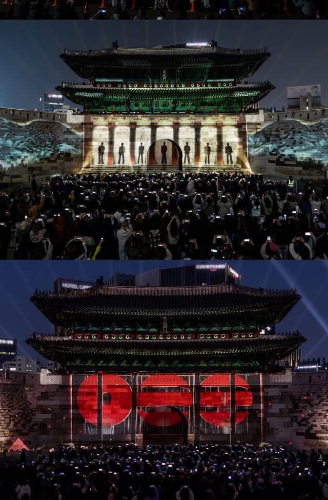 서울의 역사와 문화가 아티스트의 브랜드와 어우러져 다양한 즐길 거리를 선사했다. 이날 오후 7시 국보 1호 숭례문에는 미디어 파사드가 상영됐다. 성벽의 문이 열리자 방탄소년단의 웅장한 실루엣이 드러났고, 청사초롱을 든 멤버들이 환한 빛 속에서 유유히 거니는 모습이 석벽 위에 투사됐다. 말미에는 신보의 키 컬러인 붉은빛이 숭례문을 감싸안았다. 서울이 가진 역사적 가치에 새로운 숨결을 불어넣는 순간이었다. 현장을 찾은 시민들은 전통 건축과 방탄소년단이 함께 빚은 특별한 경험에 감탄을 쏟았다.