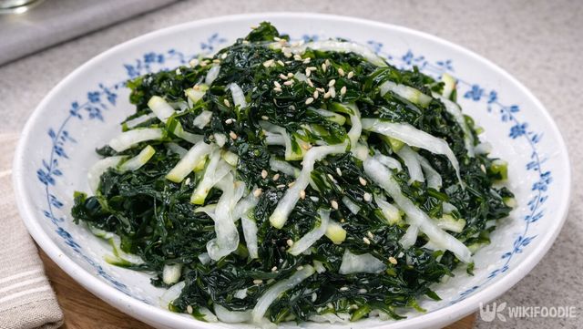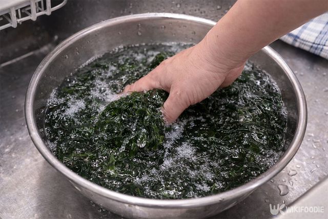 이때 소금 1큰술을 넣으면 불순물을 제거하는 데 도움이 된다. 여러 번 헹군 뒤에는 물기를 짜주는데, 너무 세게 비틀어 짜면 파래의 결이 뭉개질 수 있으므로 적당한 힘으로 눌러 짜는 것이 좋다.