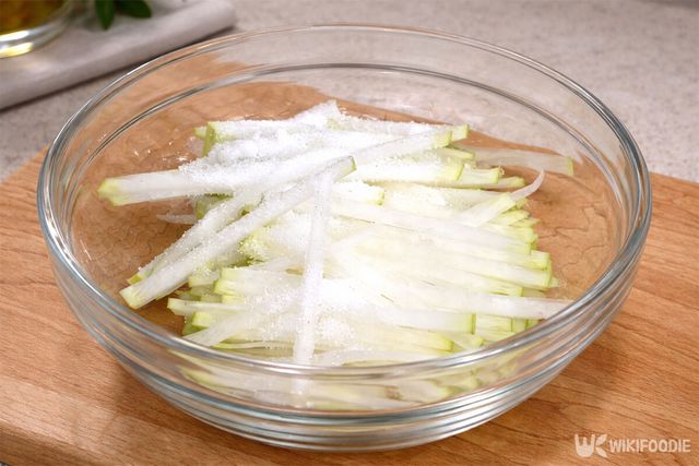가장 먼저 무 100g을 가늘게 채 썬다. 썬 무에 설탕 1큰술과 꽃소금 반 큰술을 넣고 조물조물 버무려 잠시 절여둔다.