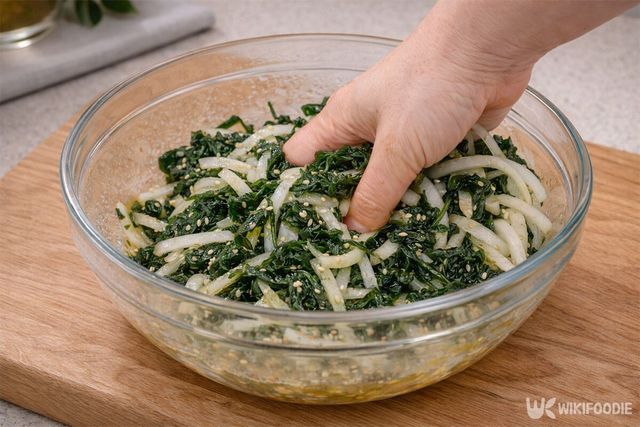 준비한 무와 파래를 양념이 담긴 볼에 넣고 가볍게 무친다. 이때 손에 너무 힘을 주어 치대지 않는 것이 중요하다. 부드럽게 섞어주어야 파래와 무의 식감이 뭉개지지 않고 살아난다. 처음 무쳤을 때는 파래가 약간 거칠게 느껴질 수 있지만, 시간이 지나 양념이 스며들면 점점 부드러운 상태로 변한다.