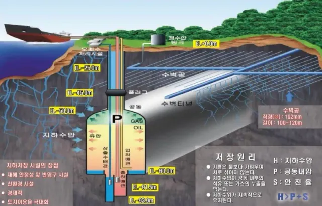 수압과 비중을 이용해서 지하에 저장하는 방식.