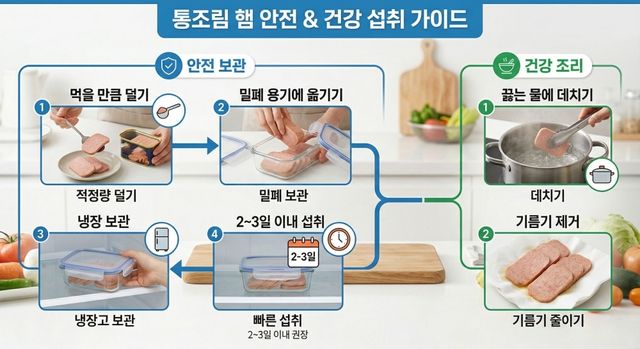 [인포그래픽] 기사를 바탕으로 AI가 생성한 인포그래픽 이미지. 먹고 남은 햄은 '밀폐용기'에 옮겨 담아 냉장 보관하는 것이 좋다. 개봉된 캔은 공기와 접촉하면서 내부 금속이 서서히 부식될 수 있기 때문이다. 또한 개봉한 통조림은 2~3일 이내에 섭취하는 것이 권장된다.