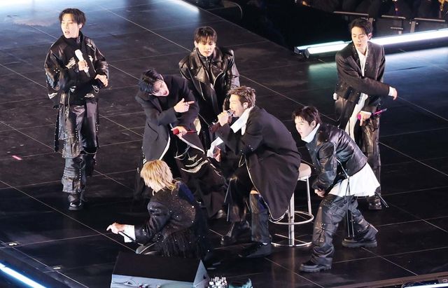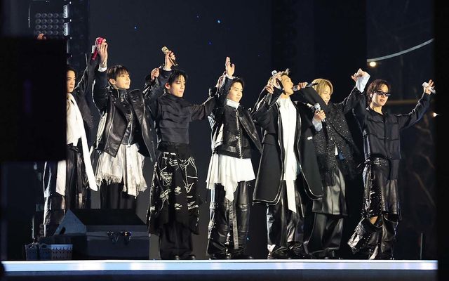 방탄소년단(BTS, RM, 진, 슈가, 제이홉, 지민, 뷔, 정국)이 21일 오후 서울 종로구 광화문광장에서 열린 'BTS 컴백 라이브: 아리랑'에서 화려한 무대를 마치고 아미에게 인사를 하고 있다. / SBTM1