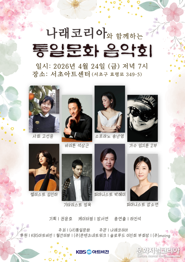 문화저널코리아 오형석 기자 |음악은 때로 말을 앞선다. 설명보다 먼저 마음에 닿고, 주장보다 오래 남는다. 같은 공간에서 같은 소리를 듣는 경험은 서로 다른 삶의 결을 잠시나마 하나로 묶어낸다. 오는 4월 24일 오후 7시 서울 서초아트센터에서 열리는 '나래코리아와 함께하는 통일문화 음악회'는 바로 그 음악의 힘을 통해 사람과 사람, 세대와 장르, 그리고 공익과 예술을 잇겠다는 뜻을 담아 마련된 무대다. 이번 공연은 (사)통일문화(대표 이상엽)와 나래코리아(대표 김생기)가 공동으로 주최·주관하는 특별 음악회로, 클래식과 대중가요를 한자리에서 만날 수 있는 구성과 더불어 예술을 사회적 메시지의 언어로 확장하려는 기획 의도가 맞물리며 주목을 모으고 있다.