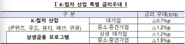우선 K-컬처 산업에 최대 1.2%포인트의 우대 금리를 제공한다. 상생금융 프로그램 참여 기업에는 0.3%포인트를 얹어 최대 1.5%포인트까지 금리 혜택을 준다.