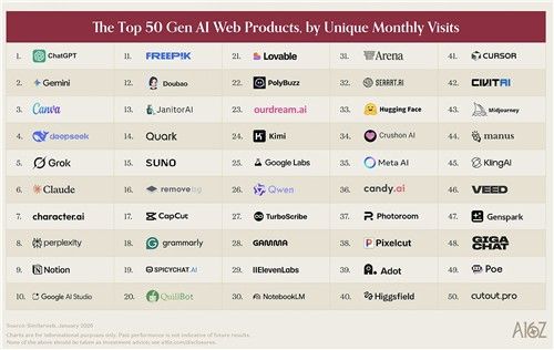 이번 순위는 시장조사기관 시밀러웹과 센서타워의 올해 1월 트래픽 데이터를 기반으로, 전 세계 소비자들이 실제로 가장 많이 사용하는 AI 서비스를 집계한 결과다. 순 방문자 수와 활성 사용자 수 등 실제 이용 데이터를 반영하는 만큼 신규 서비스 유입과 시장 변화에 따라 변동성이 큰 것이 특징이다.