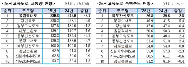 도시고속도로 가운데 교통량이 가장 많은 곳은 올림픽대로였다. 하루 평균 23만 9800대가 통행해 서울에서 가장 많은 차량이 오가는 도로로 나타났다. 이어 강변북로, 경부고속도로, 내부순환로, 동부간선도로 순으로 집계됐다.