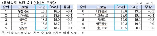 서울 시내에서 가장 막히는 도로는 종로구 우정국로였다. 평균 통행 속도가 시속 16.1㎞에 불과해 대표적인 정체 구간으로 꼽혔다. 교차로 간격이 좁고 집회와 행사가 잦은 점이 주요 원인으로 분석된다. 이 밖에도 남대문로와 율곡로, 종로 일대, 영등포 영중로 등도 시속 20㎞ 이하의 낮은 속도를 보이며 혼잡 구간에 포함됐다.
