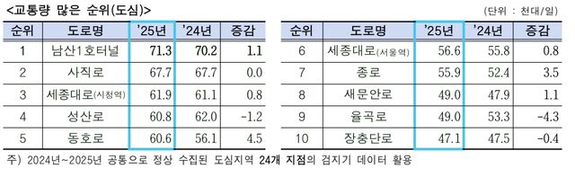 도심 도로 가운데 교통량이 가장 많은 곳은 남산1호터널로 하루 평균 7만 1000대가 통행했다. 사직로와 세종대로도 뒤를 이었다.