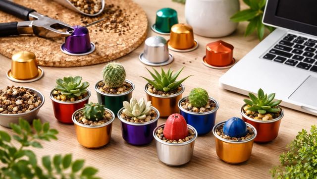 커피 캡슐을 활용한 가장 대표적인 재활용 방안은 미니 화분 및 데스크테리어 소품 제작이다. 네스프레소 등 주요 브랜드의 알루미늄 캡슐은 제품 라인업에 따라 고유의 화려한 색상을 지니고 있어 인테리어에 활용하기 좋다. 세척된 캡슐 하단에 송곳을 이용해 작은 배수 구멍을 뚫고 마사토와 배양토를 채우면 다육식물이나 선인장을 심기에 적합한 초소형 화분이 완성된다. 이는 사무실 책상이나 창가에 배치했을 때 공간의 생동감을 더하는 친환경 인테리어 요소가 된다.