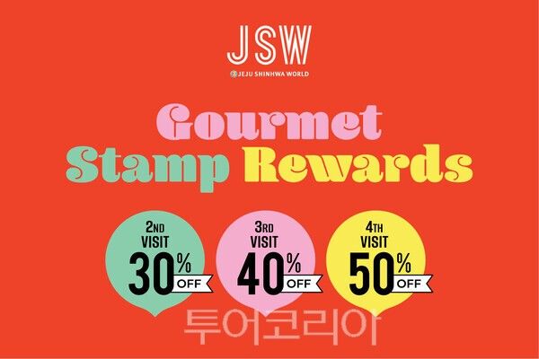 제주신화월드 내 시그니처 레스토랑을 이용하며 스탬프를 적립하면 2회차 방문 30%, 3회차 40%, 4회차 50% 할인 혜택이 제공된다. 할인은 최대 6인까지 적용된다. 참여 업장은 스카이 온 파이브 다이닝, 랜딩 다이닝, 제주선, 제주선 더 블랙, 성화정 등으로, 한식·중식·뷔페·철판요리까지 폭넓게 구성됐다.