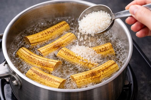 바나나껍질에 흰쌀을 넣고 끓이는 모습. 기사 이해를 돕기 위해 AI를 활용해 제작한 자료 사진입니다. 실제 모습과 다소 차이가 있을 수 있습니다.