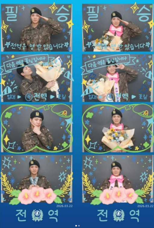 그는 전역 기념 프레임이 담긴 네 컷 사진에서 거수경례를 하거나 꽃다발을 든 채 환한 미소를 짓는 등 건강하게 군 생활을 마무리한 모습을 보였다.