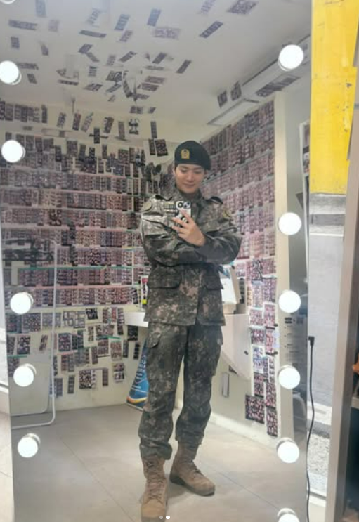 거울 셀카를 통해서는 군복을 완벽하게 소화한 이른바 ‘군복핏’과 함께 변함없는 비주얼을 과시했다.