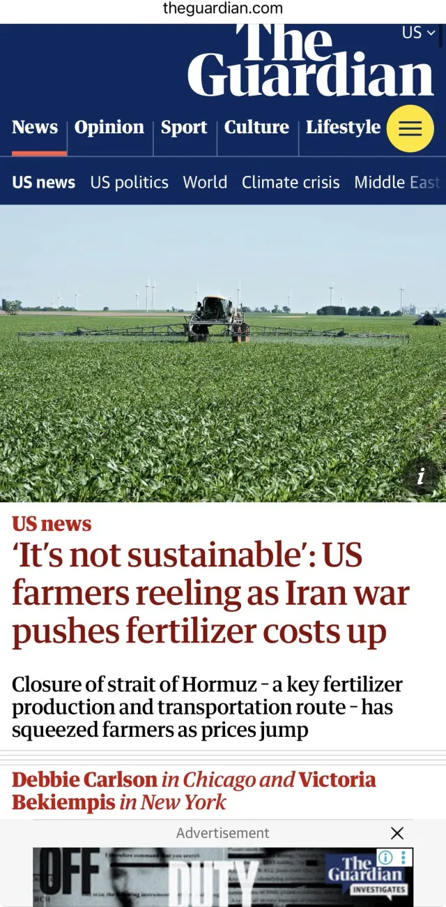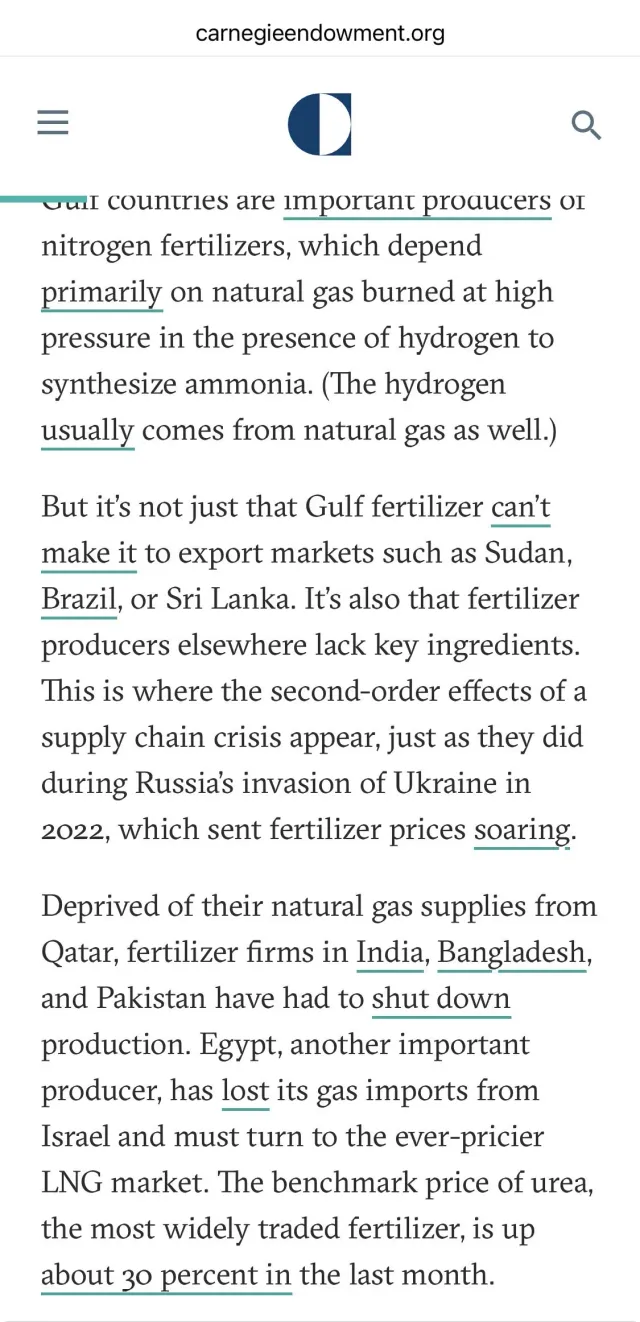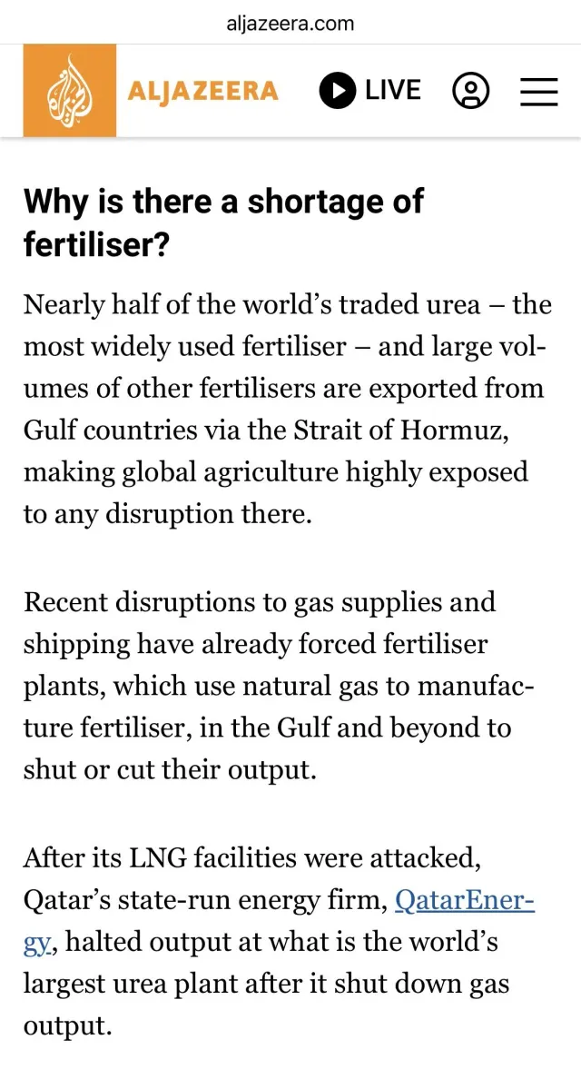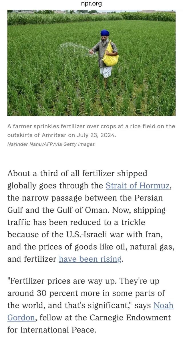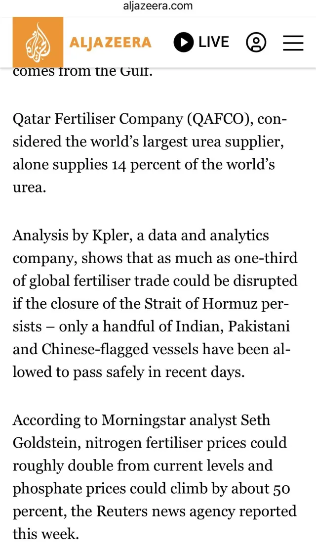 로이터 등 보도에 의하면 이미 세계 비료값이 약 30% 정도 오르고, 미국 기준도 도매가 12% 정도 올랐음