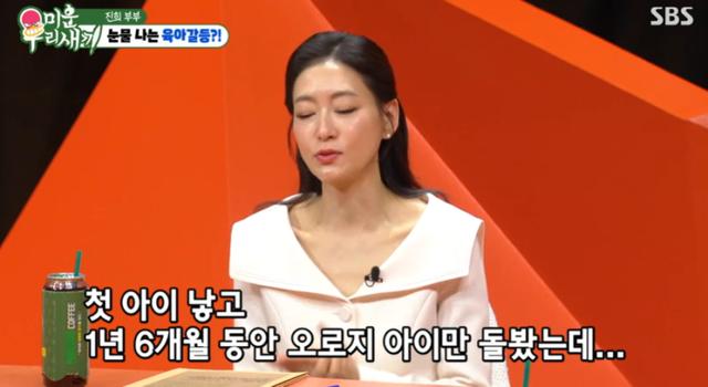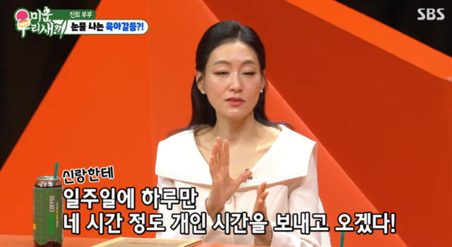 박진희는 “첫 아이 낳고 1년 6개월을 아이만 봤다. 그래서 우울감이 있었다”며 “남편에게 ‘일주일에 하루만, 네시간 정도 혼자 시간을 보내겠다’고 했다. 그때 저희가 주말부부였는데 남편은 ‘주말은 오롯이 가족끼리 보내는 시간인데 그건 좀 힘들 것 같다’고 하더라”고 말했다.