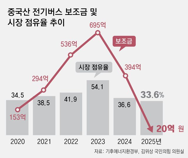 22일 기후부가 김위상 국민의힘 의원실에 제출한 자료에 따르면 지난해 정부가 지급한 전기버스 보조금 1068억 원 가운데 중국산 전기버스 보조금은 1.8%인 20억 원이었다. 1년 전(394억 원)에 비해 20분의 1로 줄었으며, 역대 최고였던 2023년(695억 원)과 비교하면 35분의 1로 급감한 것이다.
