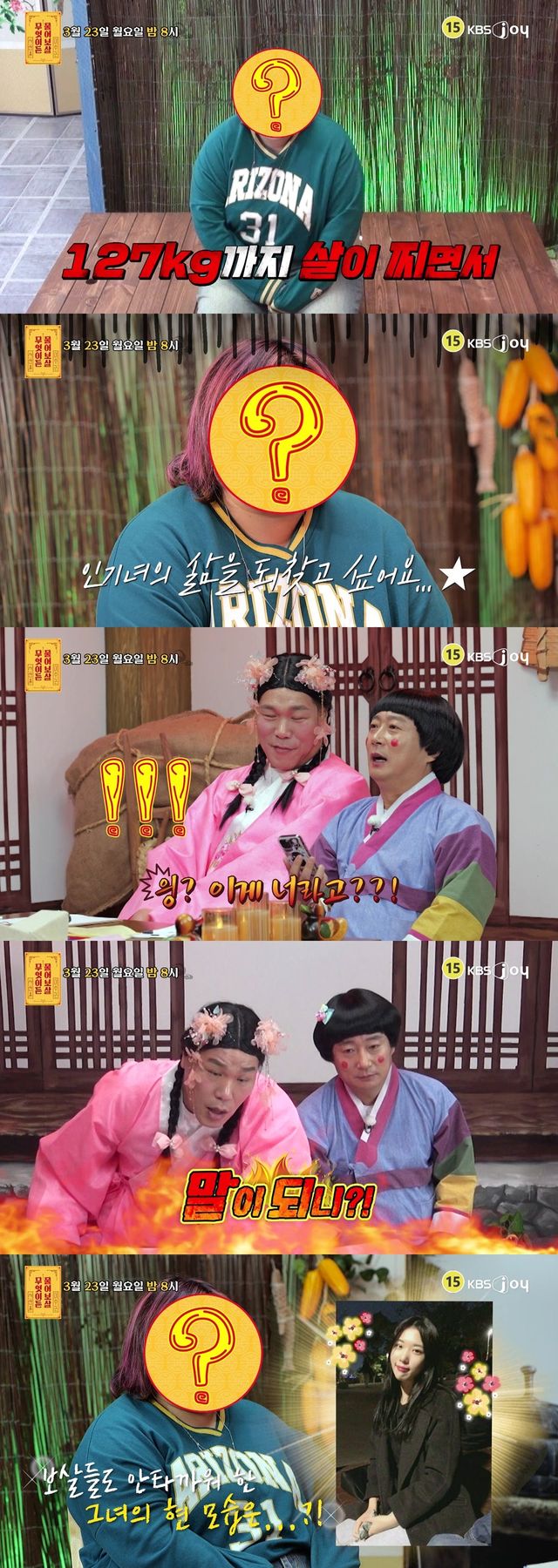 사연자는 42kg이었을 때 신세경 닮았다는 말을 들었다며 지금은 127kg까지 살이 쪄 예전의 미모를 되찾고 싶다고 고민을 털어놓는다. 이에 이수근은 사연자의 과거 사진을 확인한 뒤, “에이 거짓말! 신세경을 떠나서 예뻐”라며 놀란 반응을 보인다.
