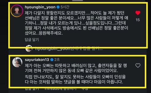 그는 이어 "제가 사석에서도 방송에서도 뵌 선배님은 정말 좋은 분이셨다. 응원해 달라"고 덧붙여 시선을 사로잡는다.