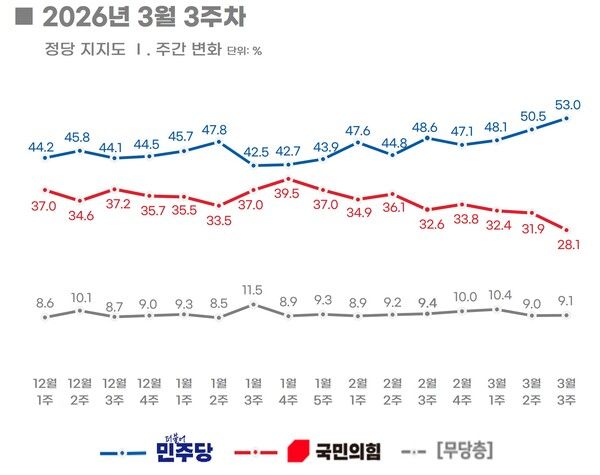 중도층은 민주당이 2.1%P 오르고 국민의힘이 3.1%P 내리며 민주 55.2%·국힘 23.0%로 집계됐다.