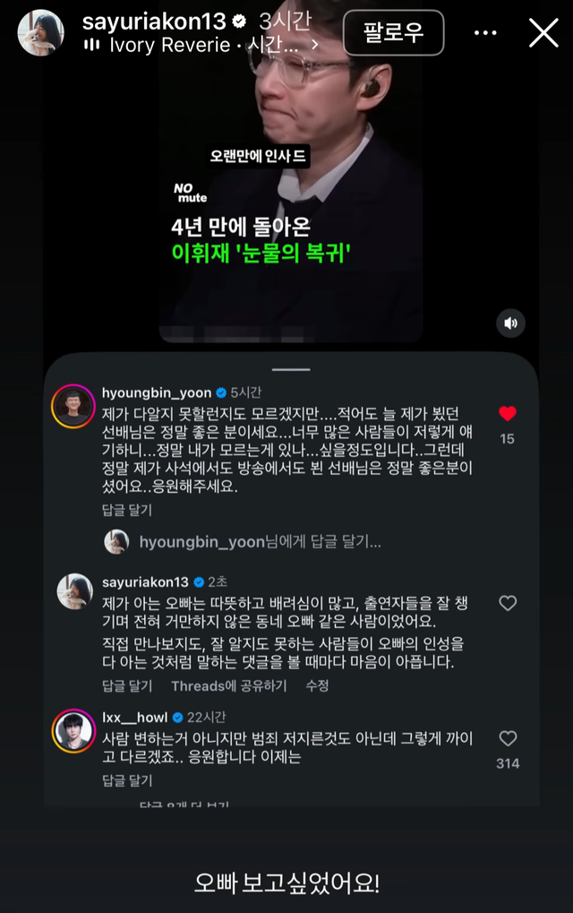 23일 사유리는 자신의 SNS에 이휘재의 복귀 장면을 캡처해 올리며 “오빠 보고 싶었어요”라고 적었다. 이어 “제가 아는 오빠는 따뜻하고 배려심 많고, 출연자들을 잘 챙기며 전혀 거만하지 않은 동네 오빠 같은 사람이었다”고 밝혔다.