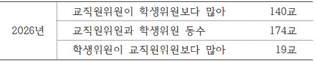 23일 교육부가 국회 교육위위원회 김문수 의원실에게 제출한 ‘2026년 등록금심의위원회 구성 현황’에 따르면 자료를 제출한 333개 대학(전문대학·원격대학 등 포함) 중 42%(140곳)는 교직원 위원이 학생 위원보다 많은 것으로 조사됐다. 이어 52%(174곳)는 학생 위원과 교직원 위원 수가 같았으며 나머지 5.7%(19곳)는 학생 위원이 교직원 위원보다 많았다.