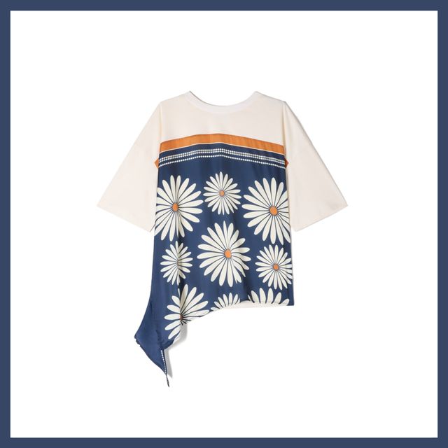 베이직한 티셔츠에 데이지 프린트 스카프가 어우러져 70년대 빈티지 무드를 자아냅니다. 비대칭 형태를 활용해 매듭을 묶어 연출하는 방법은 남다른 스타일리시함을 드러낼 수 있는 팁 중의 팁! 자유분방하고 위트 넘치는 감성을 즐기고 싶은 날에 추천합니다.