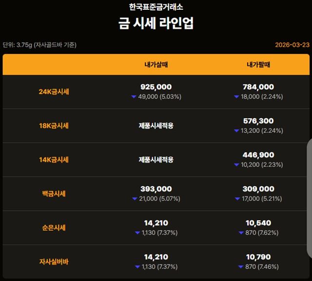 국내 금시세(금값)가 23일(이하 한국 시각) 오후 하락세(전장 대비)를 기록하며 7거래일 연속 약세를 보이고 있다.