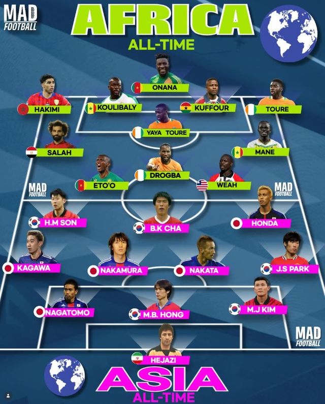 약 10만명 이상의 팔로워를 자랑하는 인기 축구 콘텐츠 매체 '매드 풋볼'은 최근 아시아와 아프리카의 '올타임 베스트 일레븐'을 선정해 비교하는 이미지를 공개했다.