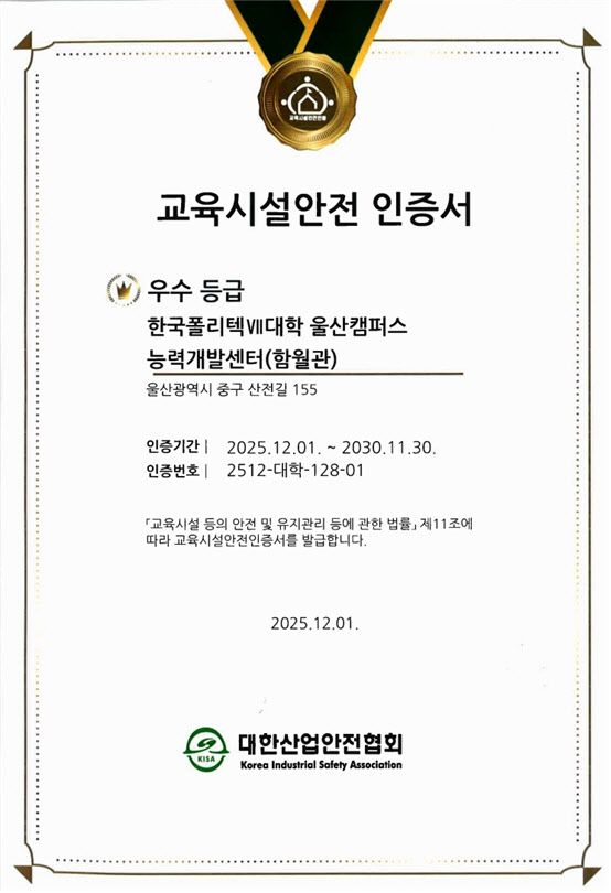 한국폴리텍대학은 이번 인증 성과를 바탕으로 실습 중심 교육 환경의 안전성을 지속적으로 유지·강화해 나간다는 계획이다.