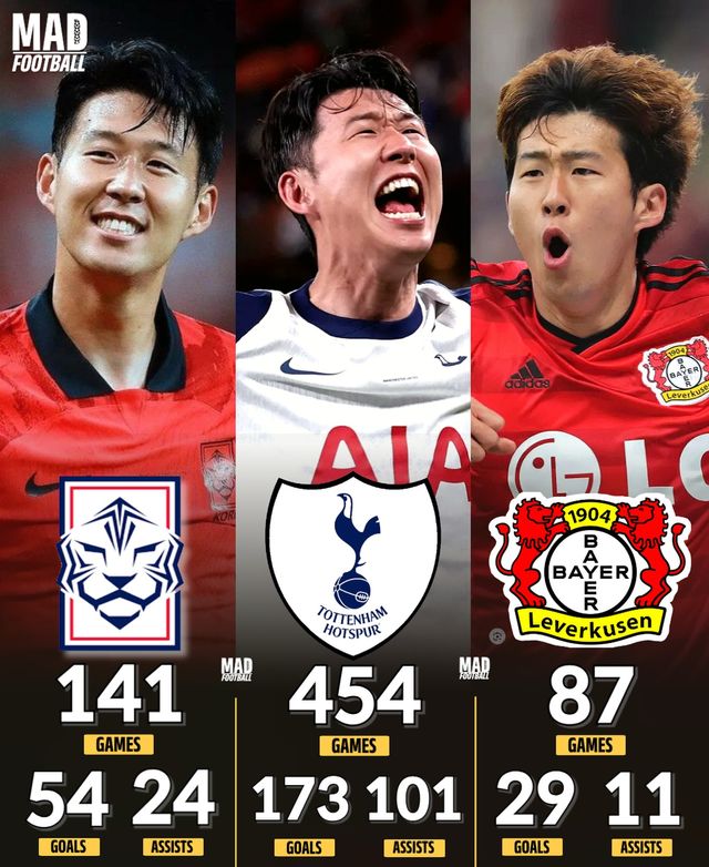 매드풋볼은 손흥민이 한국 국가대표로 141경기 54골 24도움, 토트넘 454경기 173골 101도움, 레버쿠젠 87경기 29골 11도움을 올렸다고 조명했다.