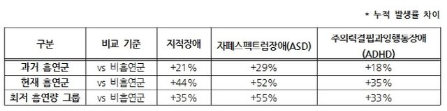 ◇ 과거 이력·적은 흡연량도 지적장애, 자폐스펙트럼장애, ADHD 위험 모두 높여