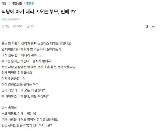 실제로 부모라고 밝힌 일부 이용자들도 “아이 둘 키우지만 솔직히 주변에 민폐가 될 수 있다는 생각은 늘 한다”, “그래서 한 명이 나가서 달래고 한 명이 빨리 먹는 식으로 대응한다”고 적었다.