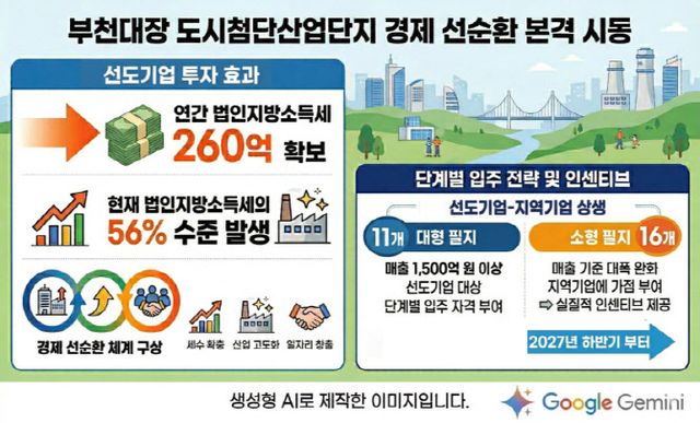 선도기업은 지난해 12월 부천시와 입주계약을 체결한 대한항공·SK이노베이션·SK하이닉스·DN솔루션즈 등 4곳이다. 이 기업들은 2029~2031년 입주한다. 입주가 완료되는 2031년 이후 연간 260억원의 법인세가 확보될 것으로 시는 보고 있다.