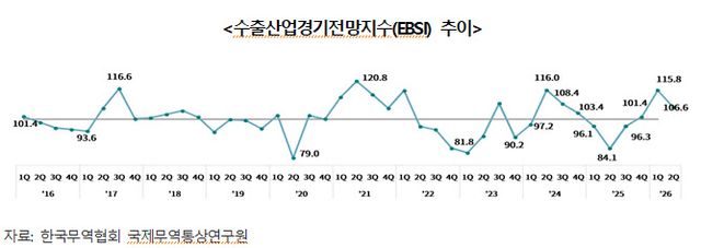 한국무역협회 국제무역통상연구원이 24일 발표한 ‘2026년 2분기 수출산업경기전망조사(EBSI)’ 보고서에 따르면, 올해 2분기 EBSI는 106.6으로 전망됐다. 지난해 4분기 이후 3개 분기 연속 100을 상회했다. EBSI는 다음 분기 수출 경기에 대한 국내 수출기업들의 전망을 조사 및 분석한 지표로, 100을 기준으로 전 분기보다 개선(악화)될 것으로 예상되면 100보다 큰(작은) 값을 가진다.
