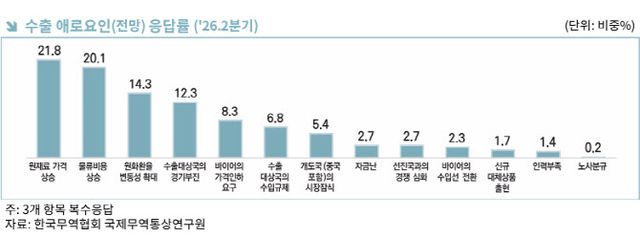 수출기업들은 올해 2분기 수출 애로요인으로 ‘원재료 가격 상승(21.8%)’과 ‘물류비용 상승(20.1%)’을 가장 많이 꼽았다. 두 항목 모두 전 품목에서 ‘상위 2대 애로’로 지목되며 전 업종의 최대 부담으로 대두됐다.