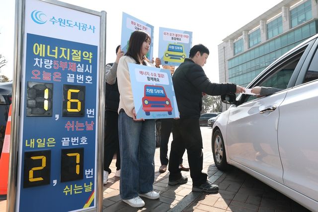 수원도시공사 직원들이 4월 1일부터 시행될 차량 5부제(승용차 5부제) 홍보 캠페인을 하고 있다. 수원도시공사(사장 이영인)는 중동지역 분쟁 심화로 국가 유가 불안정 사태에 선제적 대응하기 위해 4월 1일부터 차량 5부제를 시행한다. / 뉴스1
