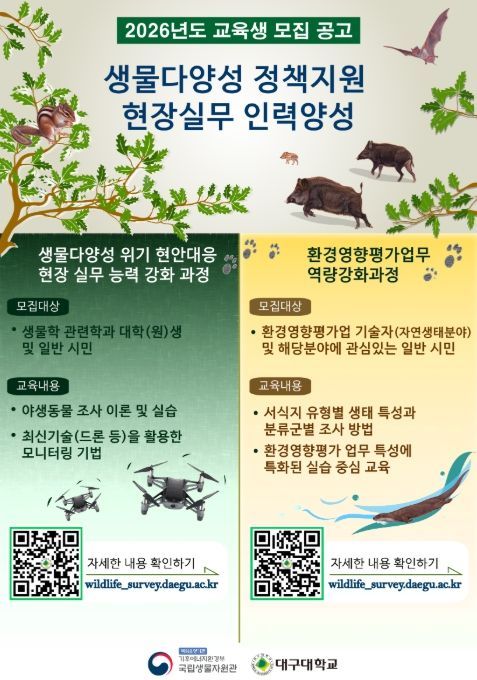 ‘생물다양성 위기 및 환경현안 대응 현장 실무능력 강화 과정’은 생물학 관련 전공 대학·대학원생과 야생생물 조사에 관심 있는 국민을 대상으로 한다. 인공지능(AI), 무인기, 열화상카메라, 무인센서카메라 등 첨단기술을 활용한 최신 생물조사 기법의 이론 및 실습 교육으로 구성되며, 전국 주요 생물 서식지에서의 현장 실습도 진행한다.