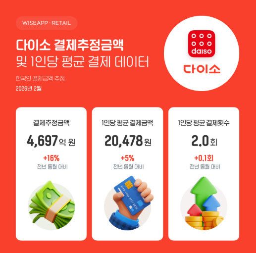 사용자 수의 증가는 곧장 결제 규모의 확대로 연결됐다. 2026년 2월 기준 다이소의 결제 추정 금액은 4697억 원을 기록하며 전년 동월의 4032억 원 대비 16% 증가했다. 주목할 지점은 단순히 구매자 수만 늘어난 것이 아니라 소비의 질적 지표인 1인당 소비 규모도 함께 커졌다는 사실이다.
