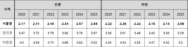 서울 소재 대학의 수시 교과전형 연도별 합격선은 △2022학년도 인문 2.45등급, 자연 2.22등급 △2023학년도 인문 2.34등급, 자연 2.15등급 △2024학년도 인문 2.57등급, 자연 2.13등급 △2025학년도 인문 2.58등급, 자연 2.08등급으로 집계됐다. 2021학년도 0.15등급에 그쳤던 격차가 2024학년도에는 0.44등급, 2025학년도에는 0.5등급까지 벌어진 것이다.