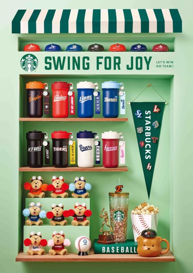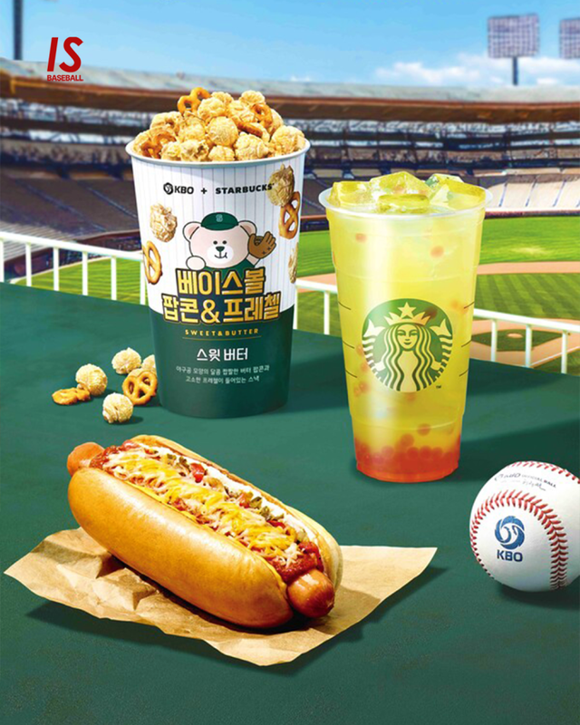 제품은 프로야구 시즌 개막을 하루 앞둔 27일부터 온오프라인에서 순차적으로 출시한다. 스타벅스는 베이스볼 매실 그린 티 음료와 베이스볼 미트 칠리 핫도그, 베이스볼 팝콘&프레첼 등 메뉴 3종을 프로야구 시즌 개막에 맞춰 선보인다. 이 중 베이스볼 팝콘&프레첼에는 구단별 유니폼을 입은 베어리스타 스티커 32종이 무작위로 동봉된다.