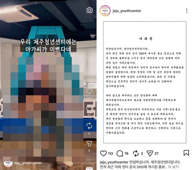 제주청년센터 인스타그램에 올라왔던 영상(사진 왼쪽.독자 제공)과 센터가 게시한 사과문.