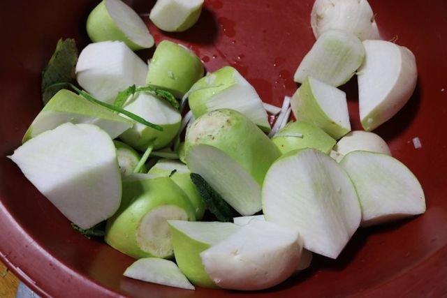 무를 썰기만 하면 요리의 절반 이상이 끝난 셈이다. 썰어둔 무를 그릇에 담고 물을 부어주면 된다. 비율은 무가 잠길 정도면 충분한데, 보통 썰어놓은 무 분량에 물 2리터 정도를 부어주면 적당하다.